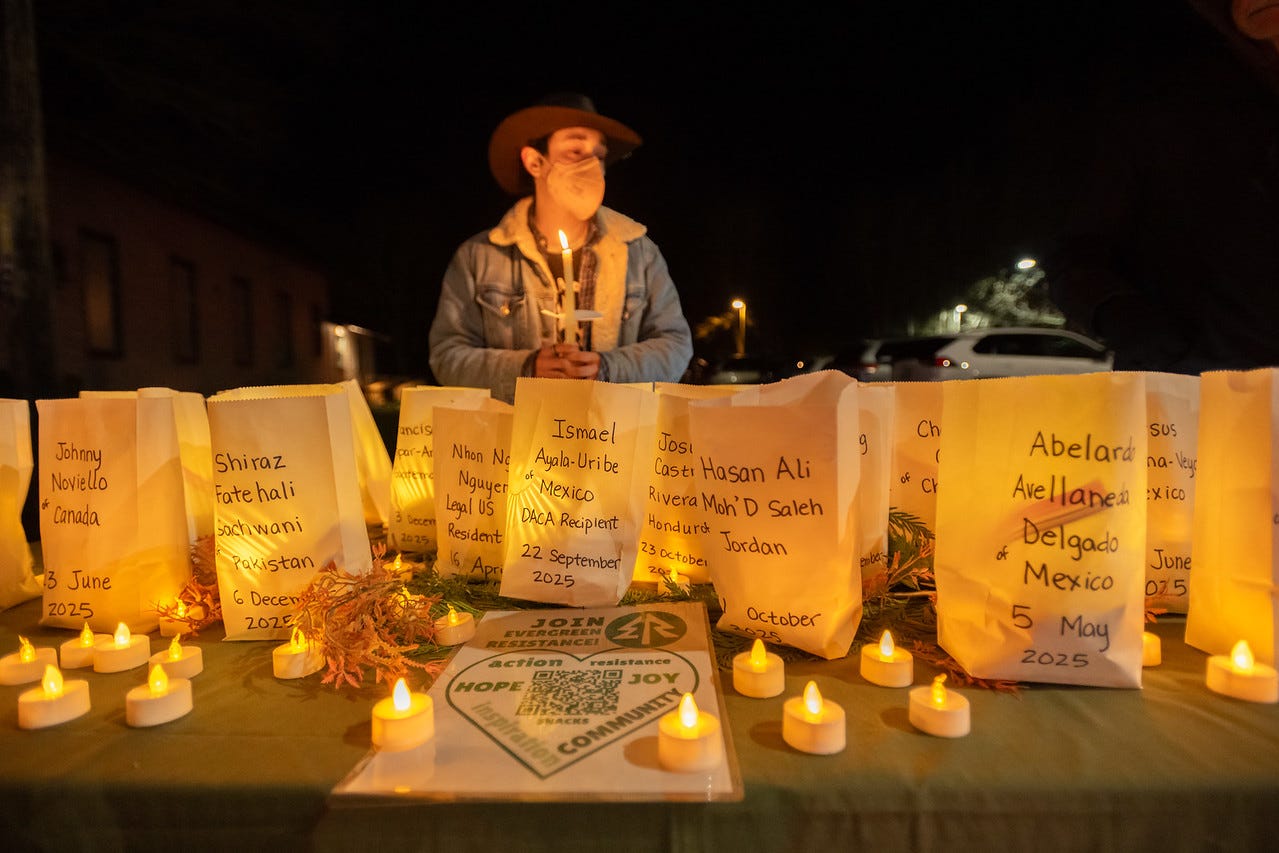 Four hundred people came out Friday for a candlelight vigil in Olympia to commemorate the victims of violence by federal immigration agents. Won't be the last time I'm out at demonstrations this year.