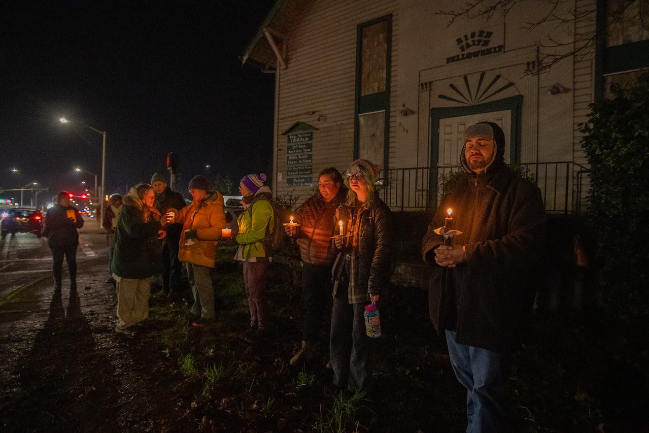 Friday was another notable date: my first night back covering political demonstrations. This one was a vigil in east Olympia commemorating the victims of ICE violence. Documenting street politics has been a necessary part of my work this past decade both for news stories, and live on social media in breaking situations.